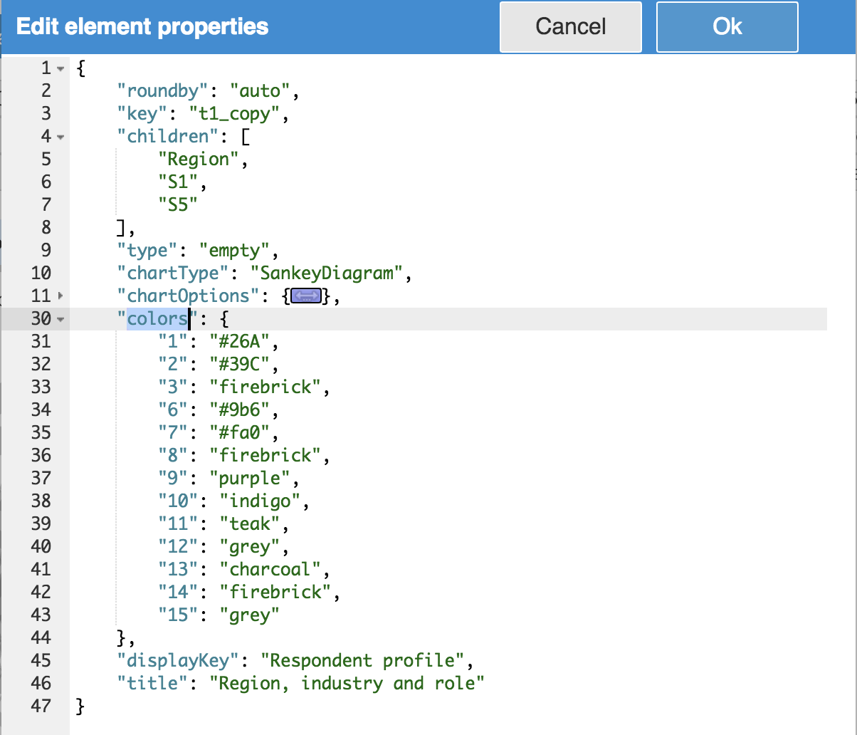 Create a new entry "colors": { "key": "color", ...} to specify colors for